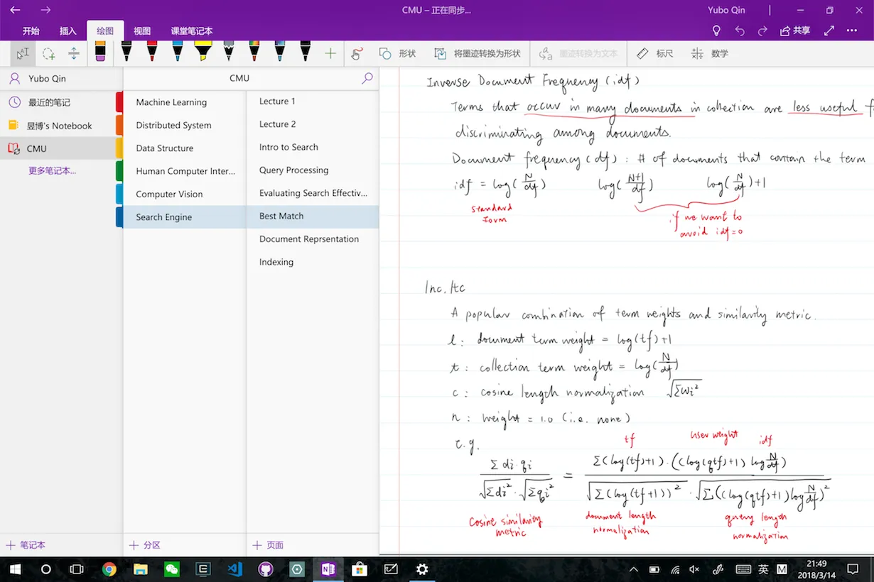 另一个我在尝试的工具是 MyScript 的 Nebo,这个在 iPad Pro 上也是非常出名的 App。MyScript 最早做了手写计算器,优秀的笔记识别让我印象深刻,这次趁 Windows Store 打折 20 块就收了下来。整体还在体验中,书写迟滞感较为明显,然而转 Word 识别准确率非常高,尤其是手画图表转成排好版的电子格式的功能让我非常印象深刻。手写转数学公式也很有用,不过对于我个人还是偏向于 LaTeX。整体笔记本管理也比较方便,直接手写笔迹导出 HTML 也远胜于 OneNote 的打印,然而由于同步不方便,应该主要还是辅助 OneNote 使用。