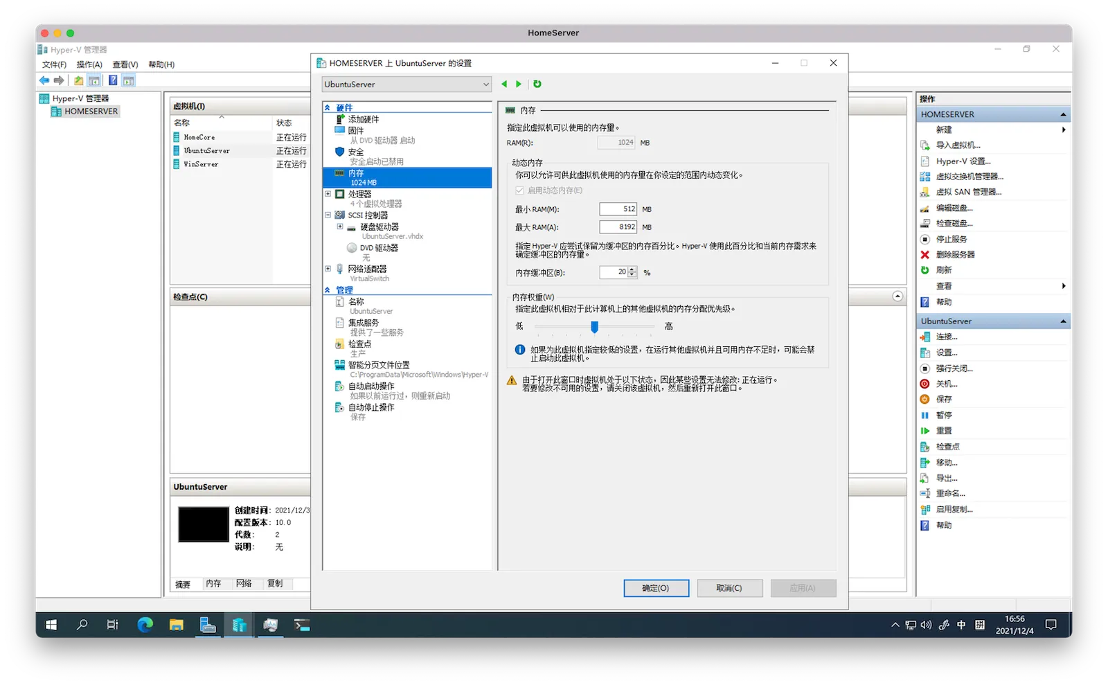 由于服务器性能较为富裕,我又开了一台 Ubuntu Server 4 CPU + 8GB RAM 的虚拟机跑一些乱七八糟的服务。顺便安利一下 Hyper-V 的动态内存分配,可以允许虚拟机在指定的内存范围内动态变化,因此即使分配了 8GB RAM,在负荷低的情况下虚拟机也只会占用大约 1GB 左右 RAM,不会给宿主机造成太大压力。注意在 Hyper-V 上运行的 Linux,可以安装 azure 优化的内核获得更好的性能。
