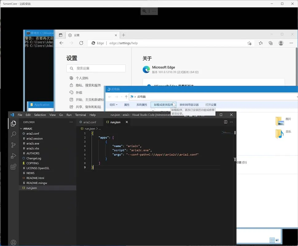 对于家用来说,大量 Linux 下的繁复操作(如挂载)在 Windows Server 里都具有内建的稳定对应功能实现,甚至由于 Server SKU + Hyper-V 还会有更高的性能表现。而且借助安装 FOD 可以让 Windows Server 获得更多方便而基础的 GUI 管理工具,如 explorer、taskmgr 等。由于 Server Core 在 CLI 外表下其实具备完整 GUI(只是没有传统桌面 Shell),我们完全可以安装使用 Edge、VSCode 等更为复杂的应用来简化服务器部署与配置。