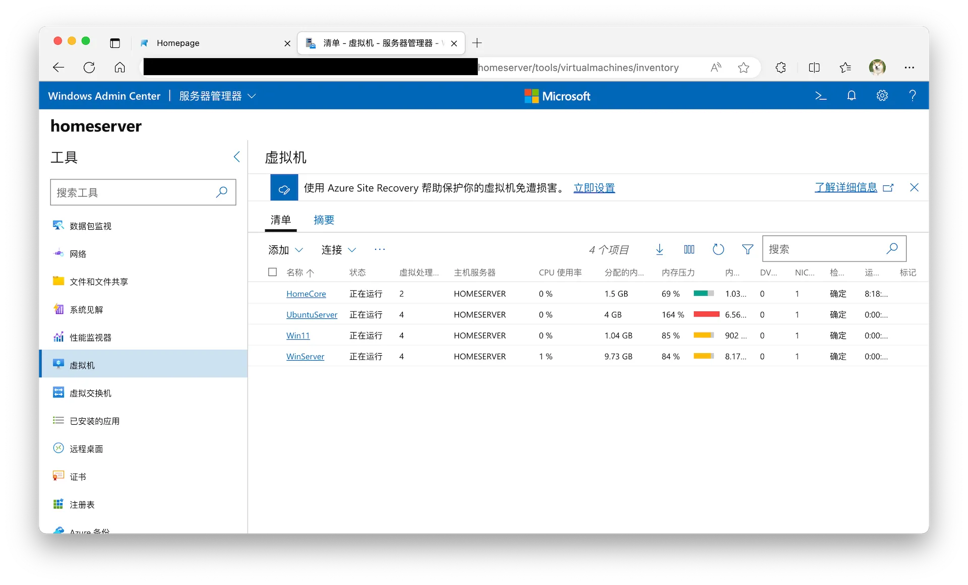 通过服务器管理器,所有基础搭建都可以轻松地通过 GUI 设置完成,不需要像 Linux 一样安装额外软件包或者修改 /etc/fstab 之类,个人感觉非常适合家用服务器的部署。存储池、文件共享和 Hyper-V 大家都比较熟悉了,这里多说一下宝藏 Windows Admin Center,这个免费的软件实在是太香了。它也是开箱即用地提供了一个完善的 web 管理页面,不仅能够实时查看服务器状态,更能直接管理防火墙、服务、虚拟机、文件甚至注册表项等。