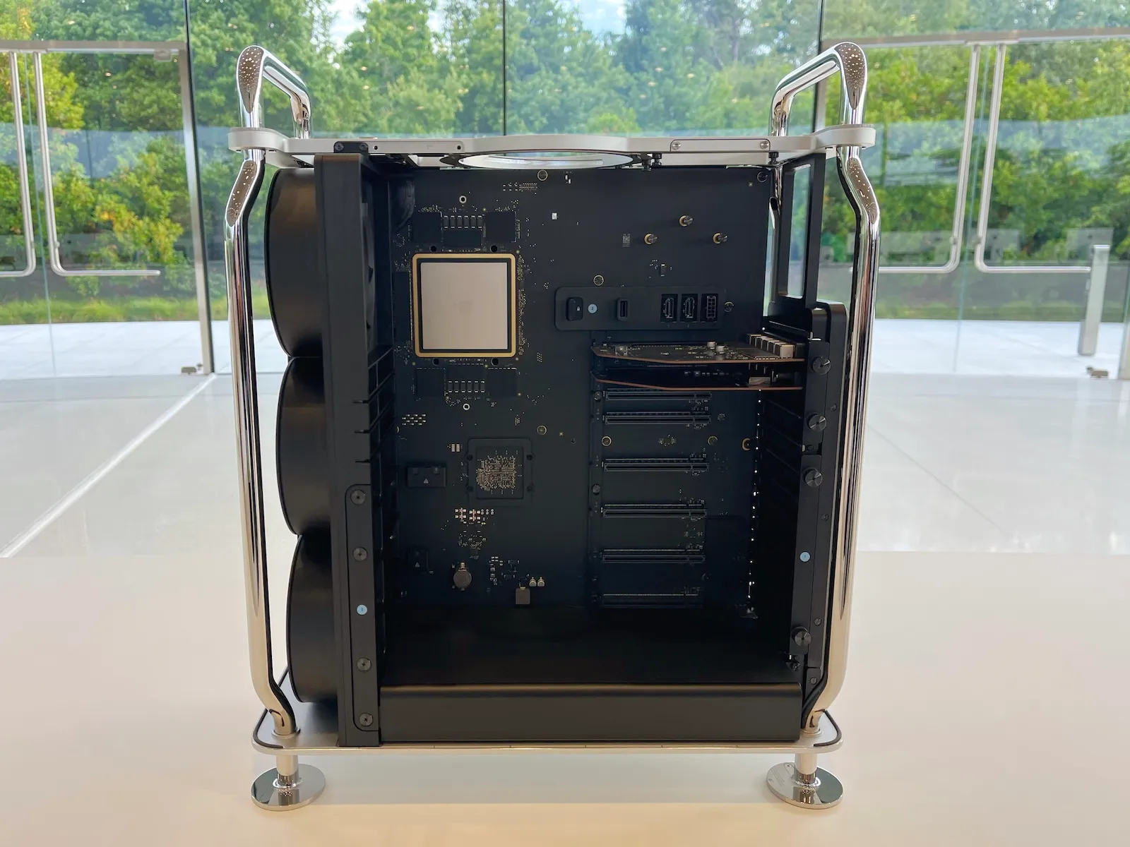 第一层展示的是常规迭代的其他硬件,能感觉到大家都没什么兴趣,三三两两稀稀拉拉地聚在设备前。我唯一驻足看了看的是 M2 Ultra 的 Mac Pro,这机箱也是太空旷了,主板上也是干干净净的。一颗巨大的 SoC,我禁不住想这良率和成本得多恐怖。PCIe 插槽不能插 GPU,那估计只有需要 PCIe audio interface 的音乐制作人们会买了。毫无内存插槽,史诗级开倒车。三个大风扇看着非常孤单,一个吹目测不到 100W 的 SoC,两个不插 PCIe 的话就吹了个寂寞。
