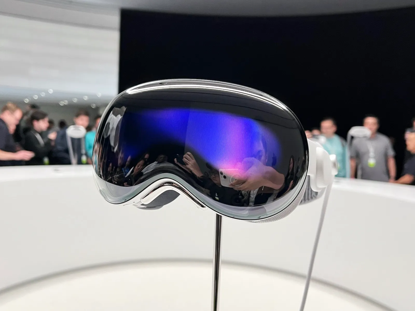 沿圆形旋转楼梯向下就是 Vision Pro 的展示空间(也就是各位在 YouTuber 们视频里见到的地方),每一台样机前都挤满了人。真的费了好大劲挤过去,又被工作人员反复强调只能看不能摸🫠。近距离接触到的时候我的第一感觉是这东西就像个滑雪眼镜,看起来似乎比视频里显着亲切一些。仔细看了一圈,作为拥有 Industrial Engineering 学位的人,我不得不感叹这玩意的制造加工精度估计高得令人发指。流畅圆润的表面曲率,极其微小且严密一致的装配公差,玻璃与金属材质均匀浑然一体,密密麻麻的传感器阵列也几乎不可见。这东西简直就像你会买到的 iPhone 一样可靠,只不过恐怖的是这仅仅是一台尚未发售甚至可能尚未量产的原型机。不知道是苹果特别挑了体质好的产品,还是在 pre-production 阶段已经实现碾压大部分品牌的 build quality 了。我注意到的另一点是,很明显地,朝向外面的那个屏幕 PPI 非常低,大果粒像素点清晰可见。不过可以理解,只是为了给别人显示一个合成的假眼睛(我还是觉得 creepy)也不需要 retina,成本控制嘛。