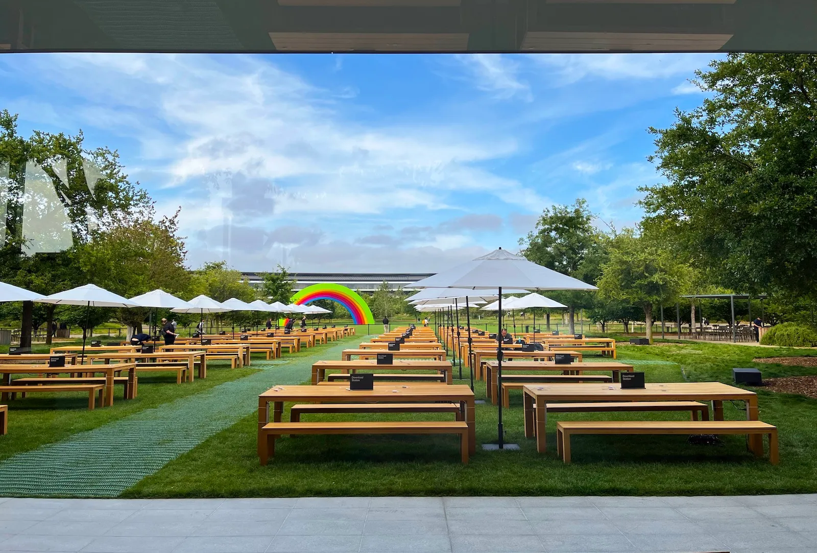 WWDC 前几天苹果会把门票以 wallet pass 发到邮箱里,但当天(或者前一天)还是需要 check-in 换成实体的 badge 的。早上 Check-in 还发了一些 swag,像是手提袋、水杯、别针之类。之后就是漫长的安检过程,然后终于得以进入 Apple Park。