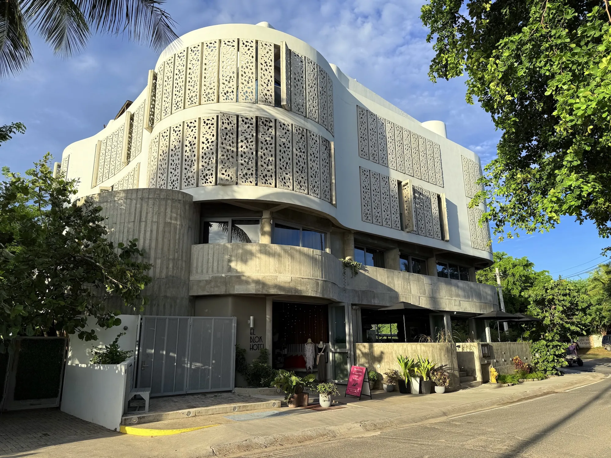 之前听朋友说,V 岛是一个“像我乡下姥姥家一样荒的地方”,确实如此,狭窄的街道、低矮的建筑、满地的溜达鸡都显示出这里经济上的不发达。打车没有 Uber / Lyft,全靠存出租车司机电话预约。整个小岛似乎也不大,仅花 15 分钟我们就从北端的码头来到了南端的酒店。这次酒店预订的是 El Blok,并没有什么理由,单纯是因为预约的 tour 集合地点在这个酒店对面,不过来了之后发现可能是设施最好的酒店了。室内室外都有大量混凝土的现代风格,房间内设施也算齐全、布置温馨。酒店隔一条马路对面就是沙滩,房间也能称得上海景。
