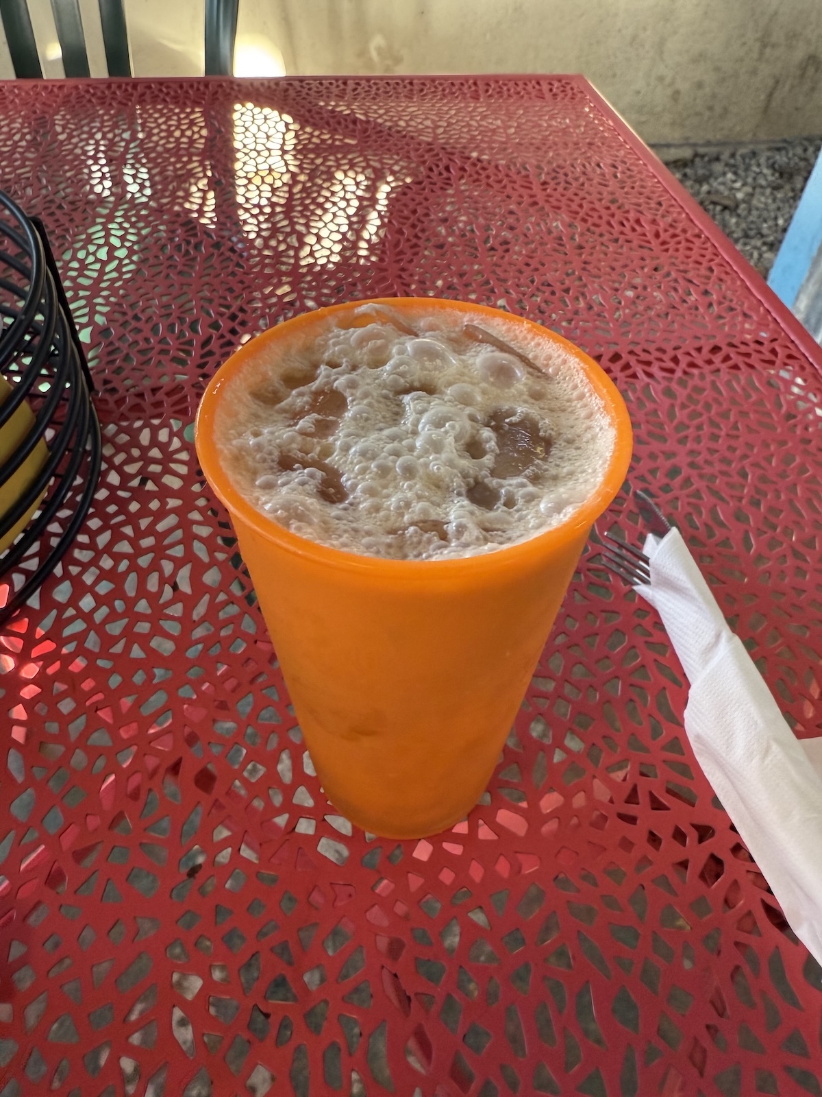夜间回到住处,随便点了杯酒、一份汤和烤鱼,口感有些柴。早上起床,去附近唯一一家开门的早餐店,店里赫然写着“Today’s Menu: Eat It or Starve”,不过友善的老板还是给了我几个选择。点了份 coconut coffee 和 cinnamon pancake,咖啡是用廉价的破塑料杯盛着漂着谜之泡沫的液体,看起来干净又卫生,不过喝起来意外地味道还不错。吃完早饭便打车去码头,坐船回主岛了。