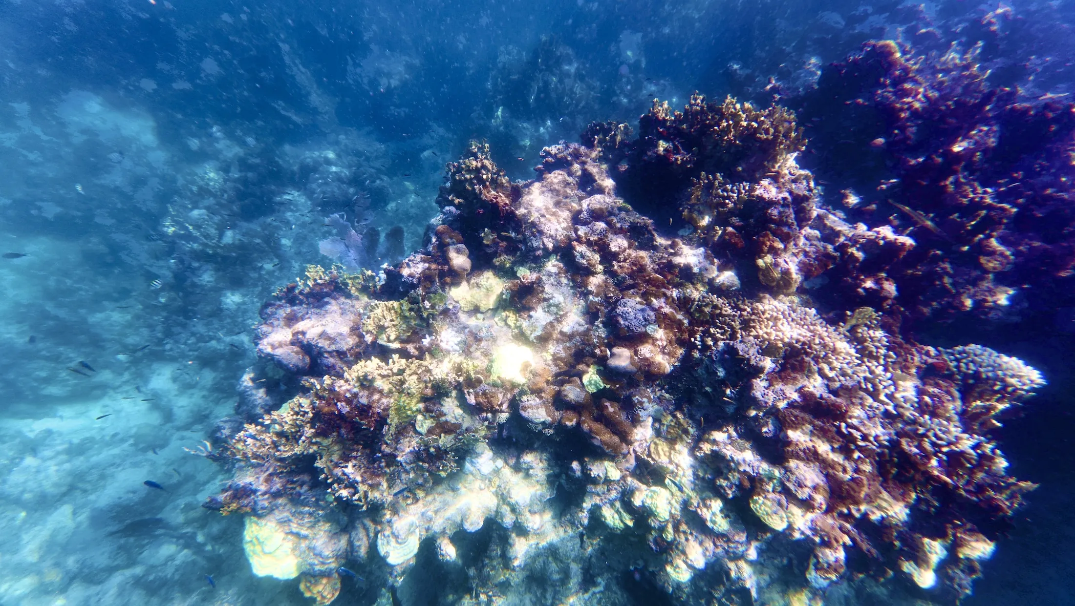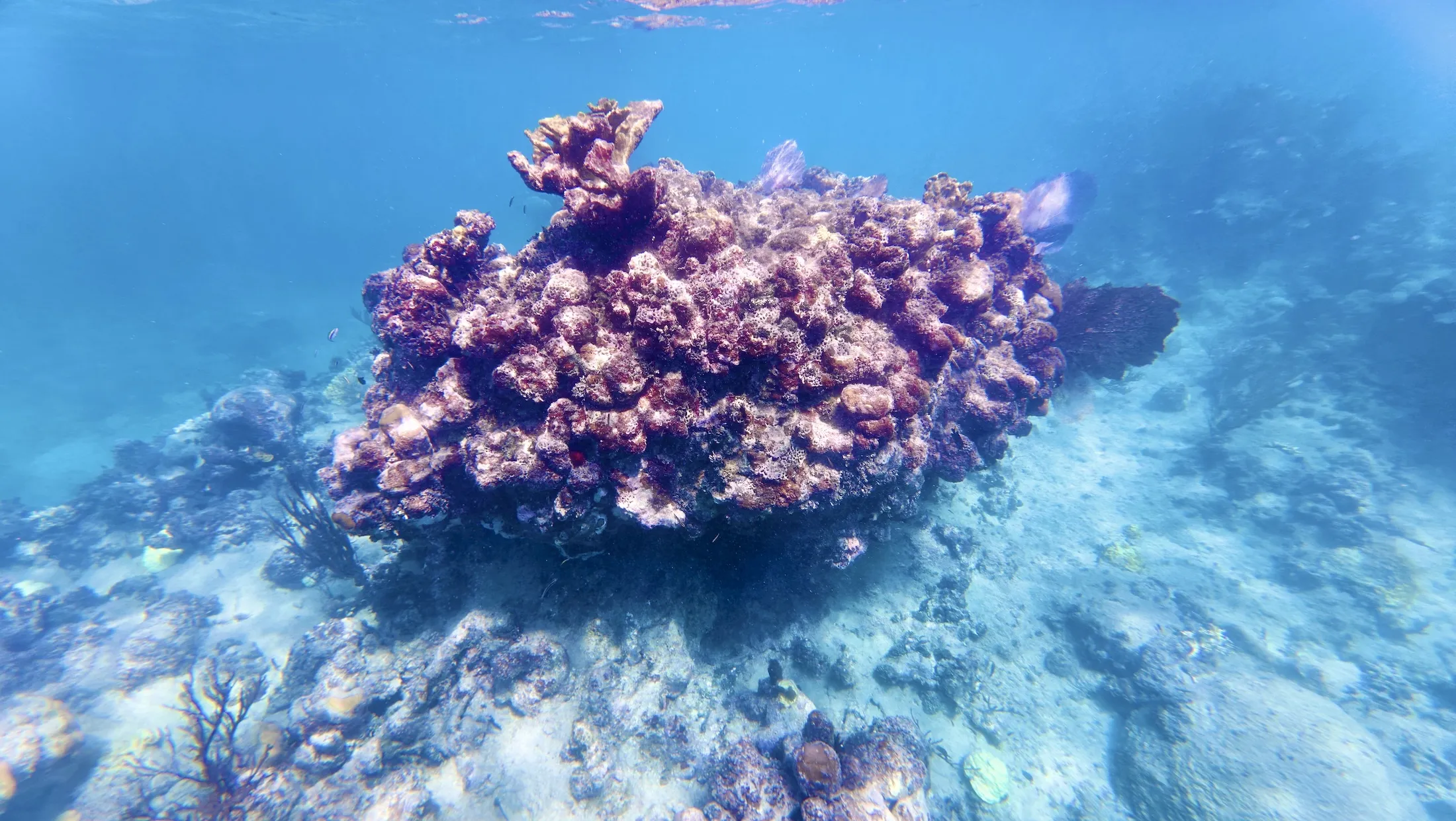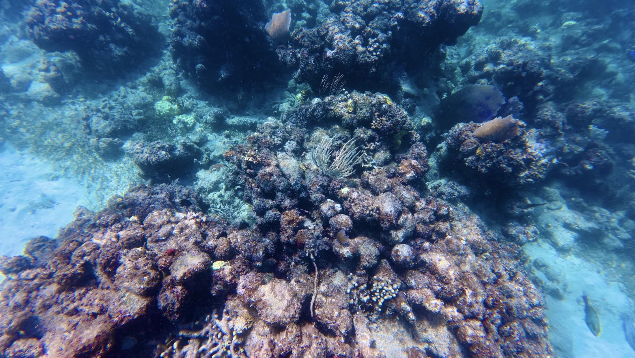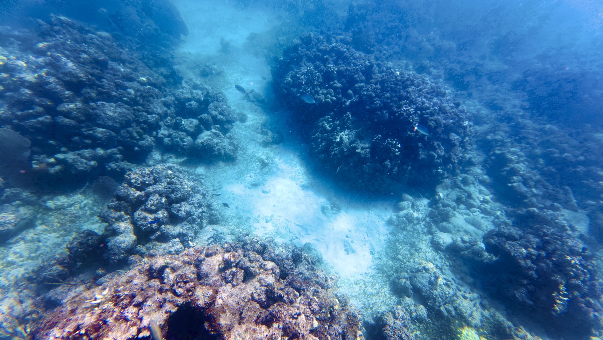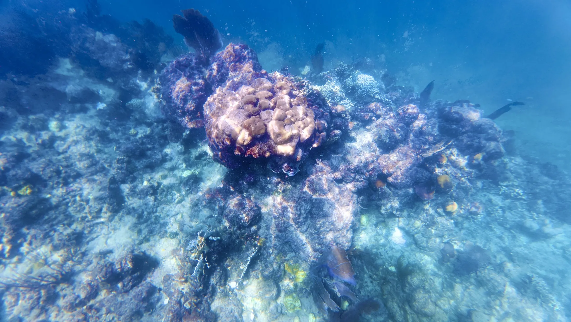 回到船上,工作人员准备了简单的午饭,吃完后开船去下一个点位。下一个点相对更深,水深有约 40 - 50ft,需要往岸边游才能看到珊瑚。导游介绍说这边的珊瑚是像一堵墙一样沿着海岸线生长的,所以是从深水往浅水游去看。下水后能见度果然差了很多,绿糊糊一片什么也看不到,只能一直往岸边游,而且感觉到好几股温暖或冰冷的海水水流冲击身体。游了几分钟突然看到非常大棵的珊瑚礁,确实规模庞大,甚至有时候让我想到 GoT 里的北境长城。可惜运动相机的广角镜头无法记录这种巨物冲击感,只能默默赞叹大自然造物的神奇。