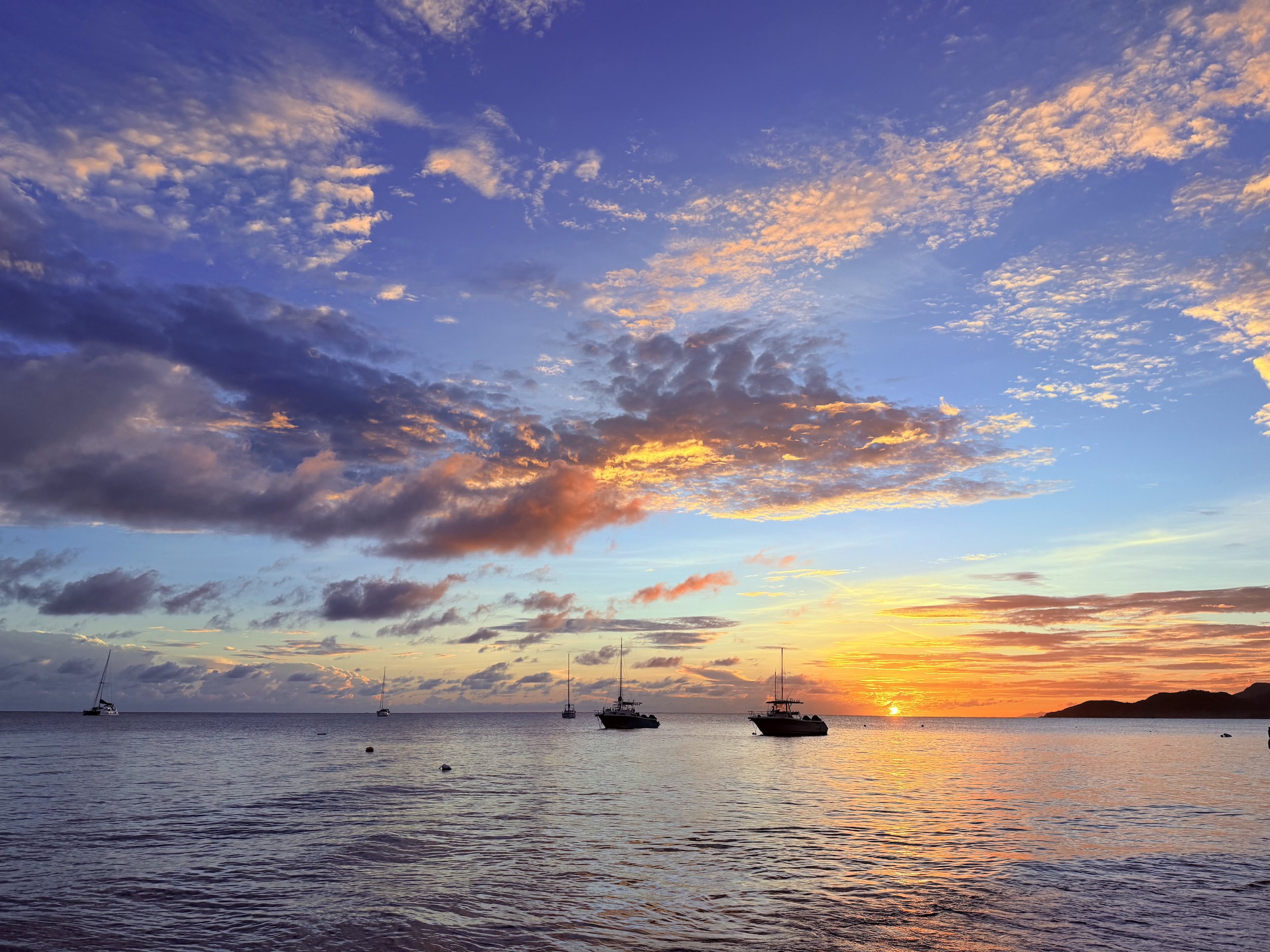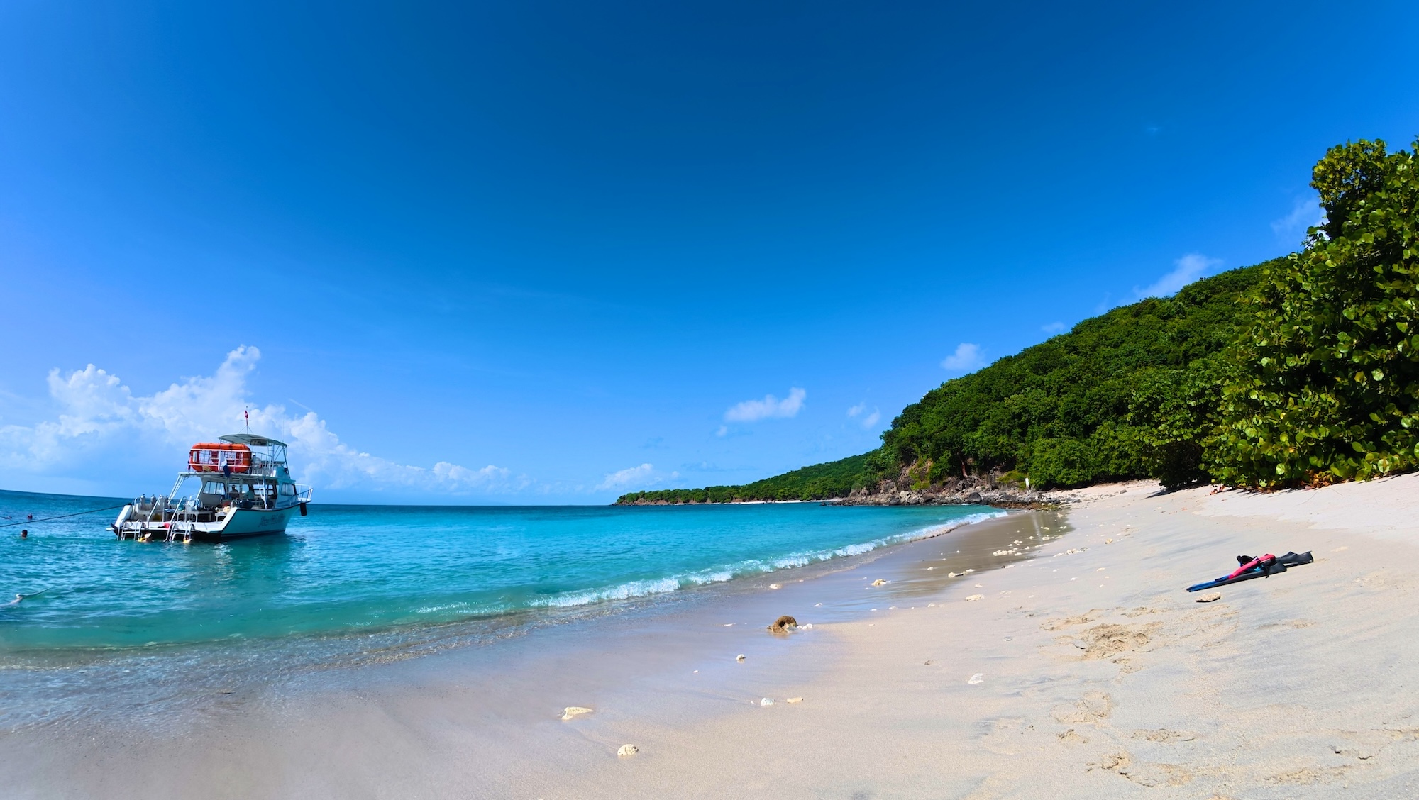 在 Culebra,我们报了一个很受欢迎的浮潜 tour,导游开船带着去 C 岛两个点,据介绍是无人的自然保护区。我们早上从主岛东北部一个码头出发乘上导游的船,船不大却也能容纳 30 人,其中还有两个游客是潜水的大哥,带着氧气罐和各种高级装备。船上准备了免费的零食水果和冰汽水,大概开了 1h45min 的船才到了第一个浮潜点。一路上非常颠簸风浪很大,一阵雨一阵晴的,到了地方倒是风平浪静。导游大概讲了一下活动区域,我们就穿戴好装备下水了。之前在恐龙湾也浮潜过,但感觉加勒比海里珊瑚好像更大,珊瑚礁里的小生物也更多更活跃。水中漂浮着大大小小的水母,珊瑚丛中游着颜色体型各异的鱼虾。我使用 DJI Action 5 Pro 拍摄了很多视频,但想拍照片时发现这个官方的 extension rod kit 并不带拍照按键,需要以一个诡异的姿势去够机身上的按键,只能匆匆拍几张全分辨率的 40MP 照片。这个点位水比较浅,导游也特意嘱咐不要踩到珊瑚破坏生态。在水里扑腾了一个小时左右我便游到沙滩上躺着了,阳光下的加勒比海确实有些展现出所谓“果冻色”的质感。