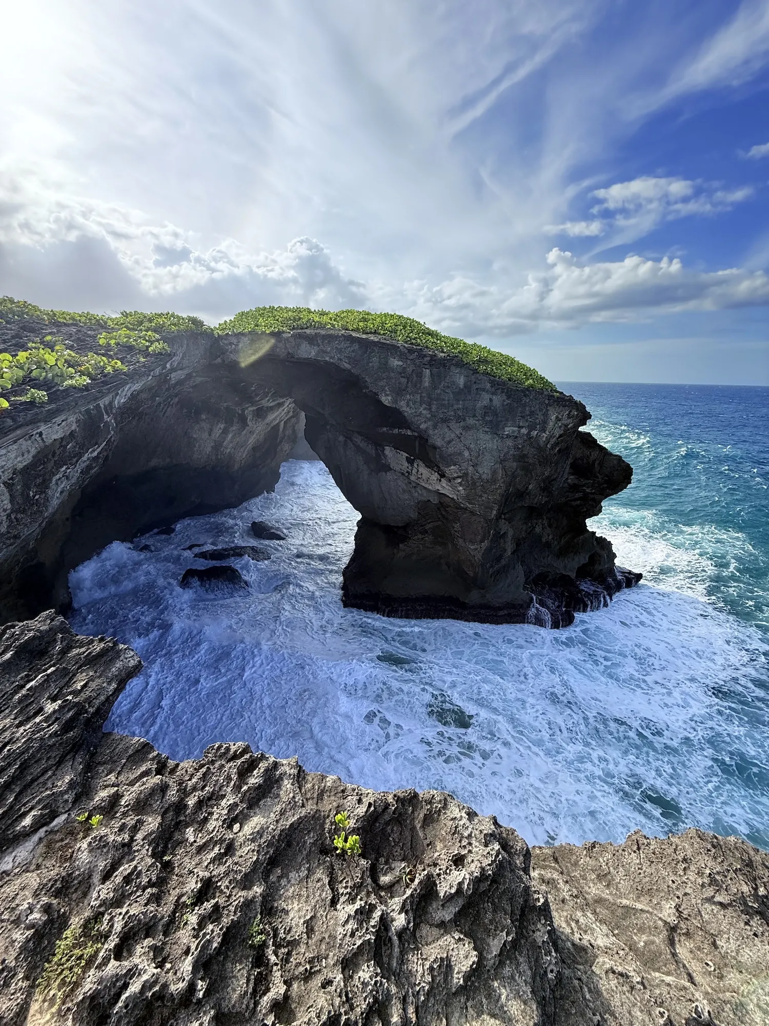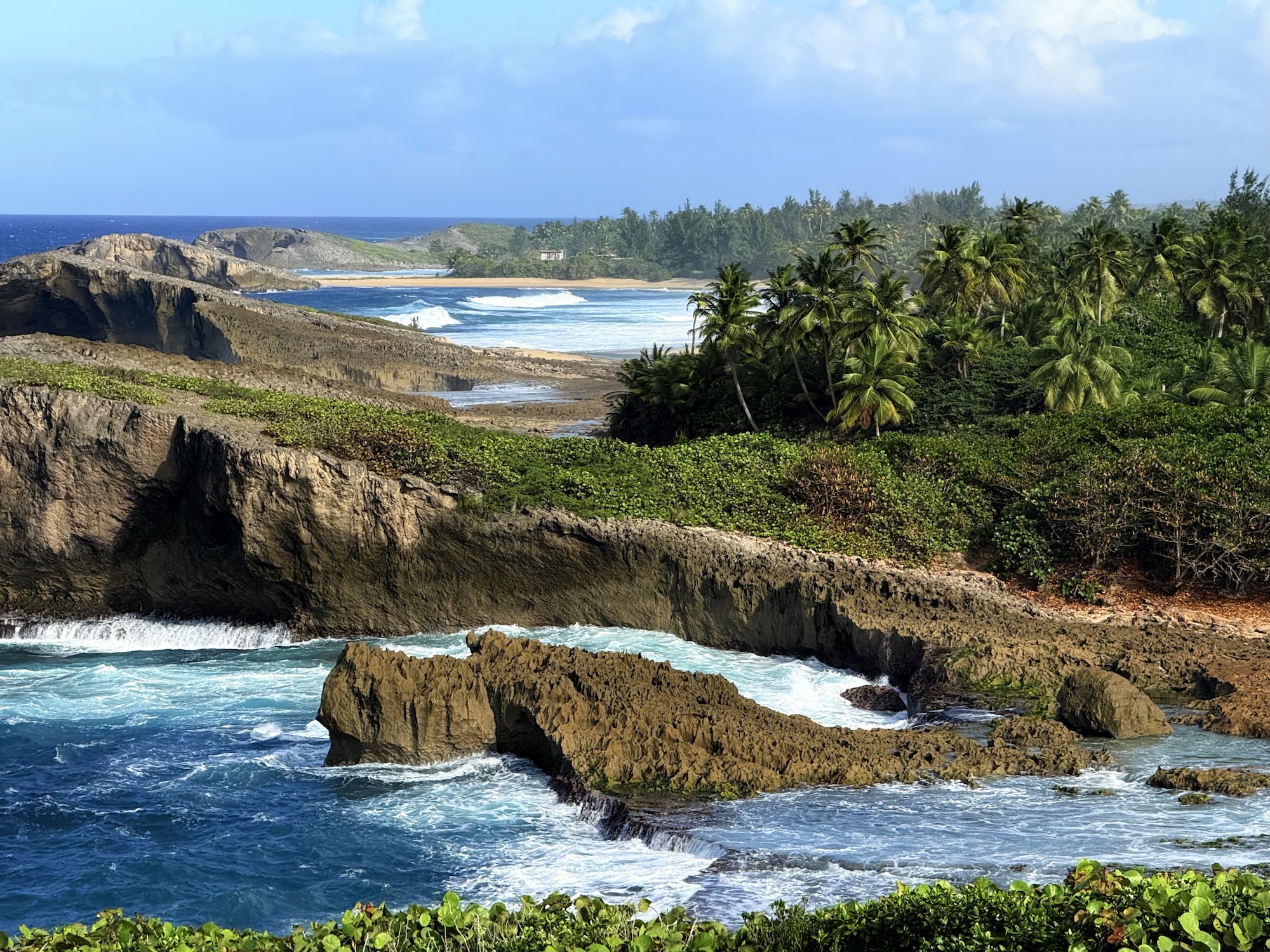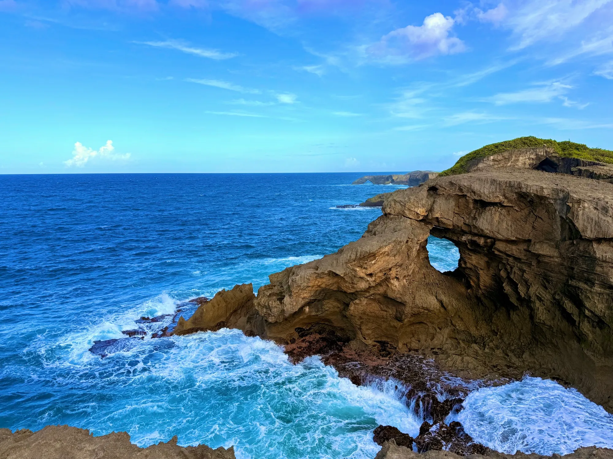 Cueva del Indio 是海边一片石头形成的岩洞、拱桥等景观,也曾是某部《加勒比海盗》的拍摄地。石头坡由于长久的海水侵蚀形成了密密麻麻坑坑洼洼的地貌,并不是非常好走,有些地方也会有乍一看是个小坑、仔细一看竟没有底直接透到海面的坑洞,还是得小心攀爬的。岩石拱桥内部形成的狭湾风大浪急,海水甚至能直接打到悬崖边的我身上。岩石延伸不远便迅速过渡成沙滩和热带雨林,也是蛮神奇的地貌。