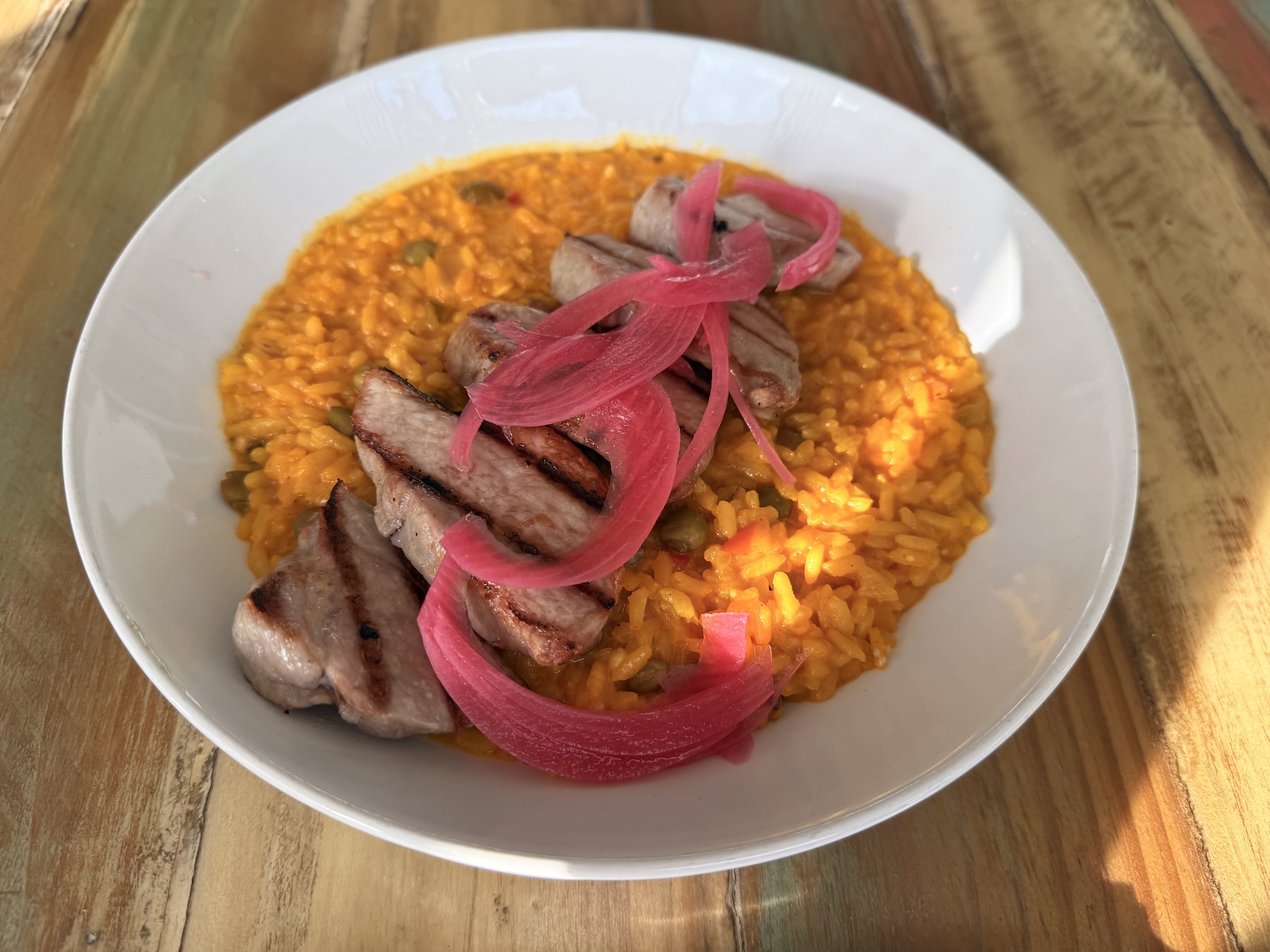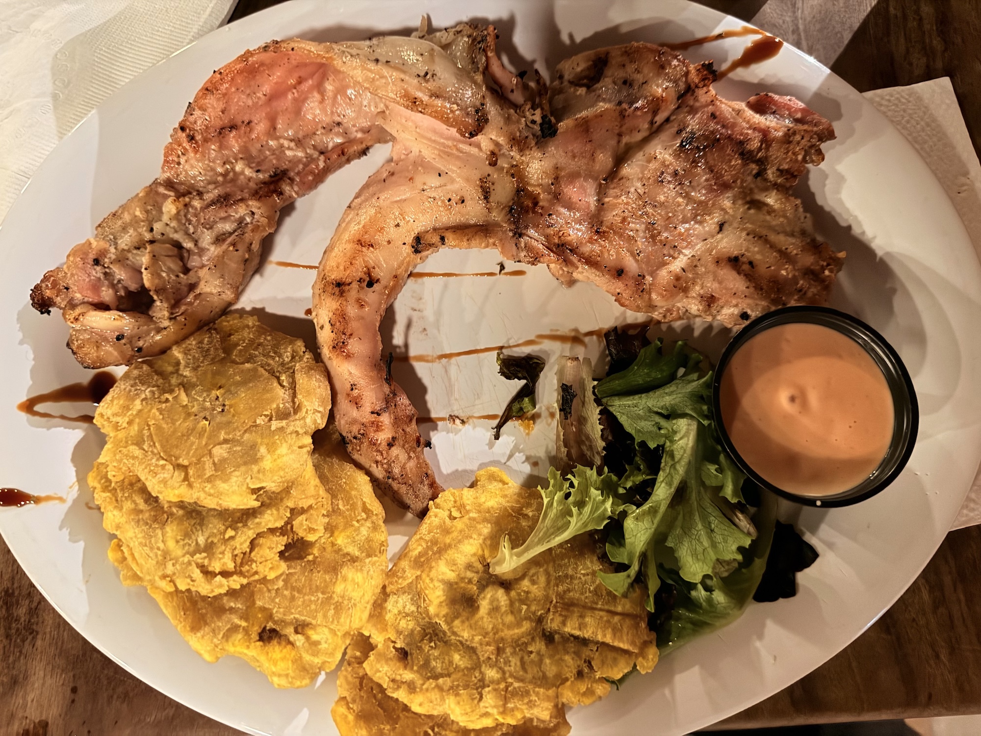 酒店里餐厅的评分都低的令人发指,所以还是尽可能出去吃当地 puerto rican 菜。有两家餐厅我还蛮喜欢的,一家是 Terruno,小小的海边小店,有大叔在吹萨克斯。Pina Colada 调的甜香微辣非常清爽。烤章鱼十分鲜嫩,配上某种酸甜的果酱(也许是杏/橘子)非常开胃。很有特色的是烤的半只去骨兔子配炸的某种当地大芭蕉果实,兔肉也是外焦里嫩。另一家是 Don Pepe,这家店就更小了只有不到 10 个位子,而且是那种每个人进来都和老板热情互相打招呼的那种熟人店。点了波多黎各特色小吃拼盘,有一种像炸鲜奶一样的东西还挺好吃的。另点了一个烤猪排配椰子饭,猪排应该是炸过,外皮酥脆焦香,猪肉又火候恰好满口爆汁,椰子饭也是淡淡甜味很解腻。在波多黎各吃的其他餐厅也都还可以没有踩雷,不过没有这两家那么合我胃口了。